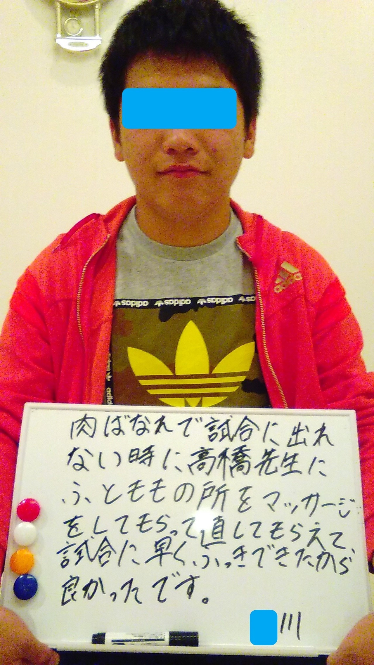 最初は歩くのも痛くて、試合前なのに練習出来なくてつらかったけど、先生のおかげでどんどん良くなってすぐ動けるようになって、とても感謝しています!