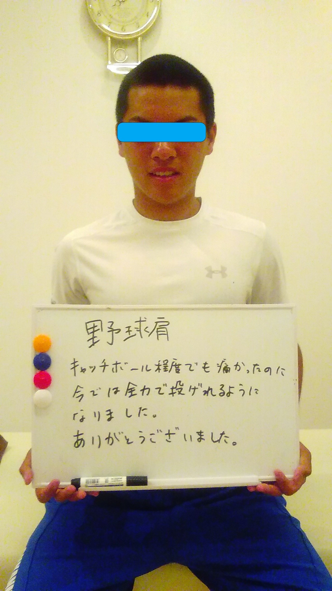 数か月前から肩の痛みがあり、キャッチボールも出来ないほどに悪化し、他院にて治療するも良くならず、HPを見て来院
